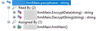 Just setting the connection string to a blank string. You would’ve also noticed that I included a passphrase. I’ll come back to that later. So what else is modifying the connection string? ███.frmMain.tmrStart_Tick is doing something…